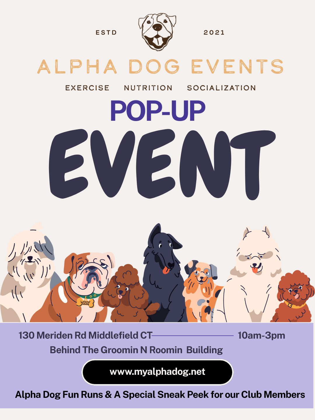Alpha Dog Events is hosting a Pop-Up Event this Sunday, September 21st at 130 Meriden Rd, Middlefield, CT (behind The Groomin N Roomin Building) from 10 AM – 3 PM! Come hang with the pack , check out our Alpha Dog Fun Runs, and get a special sneak peek just for our Club Members. Mark […]